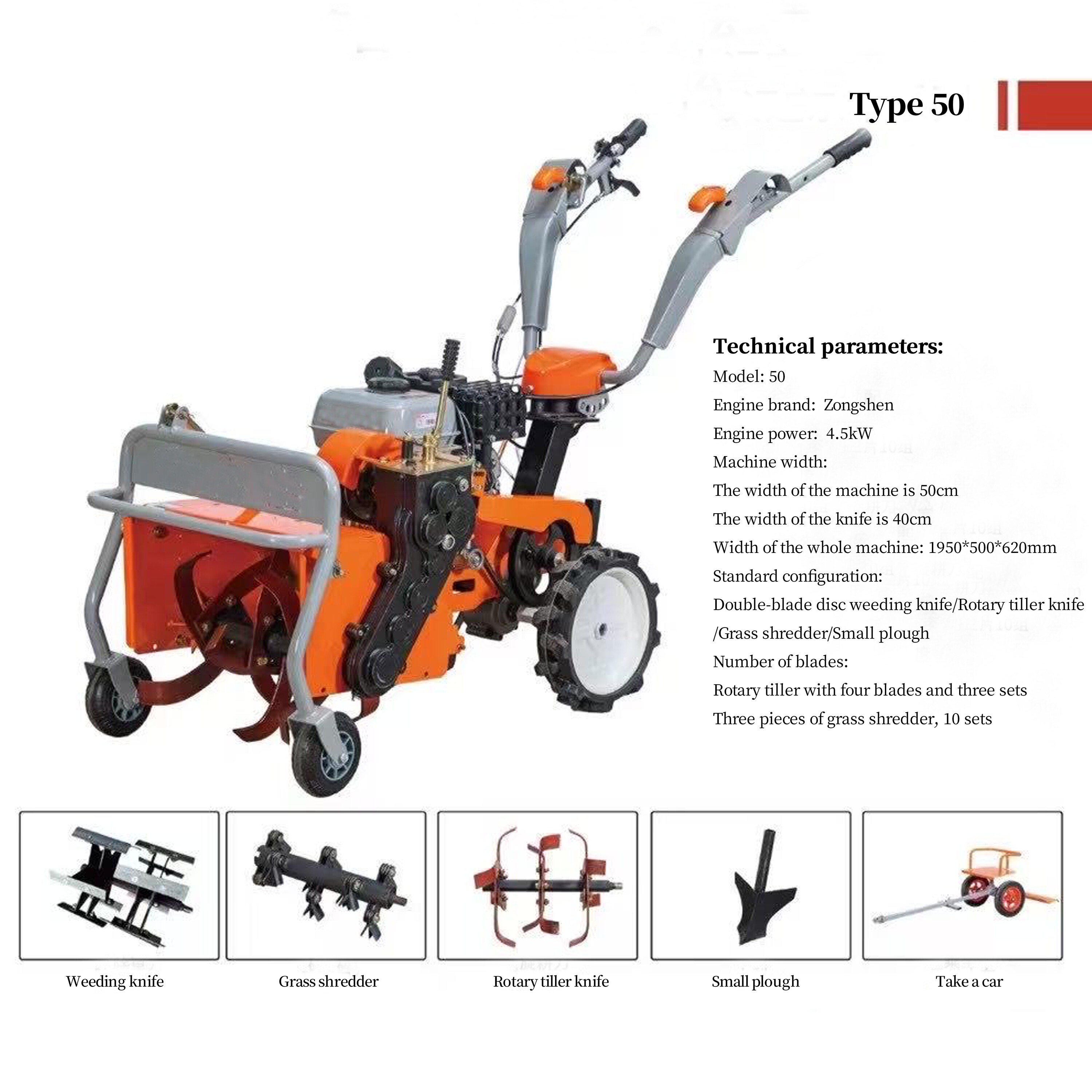 Generally comes with four agricultural implements: weeding knife, grass shredder, rotary tiller, and furrowing plow (a seat can be added).