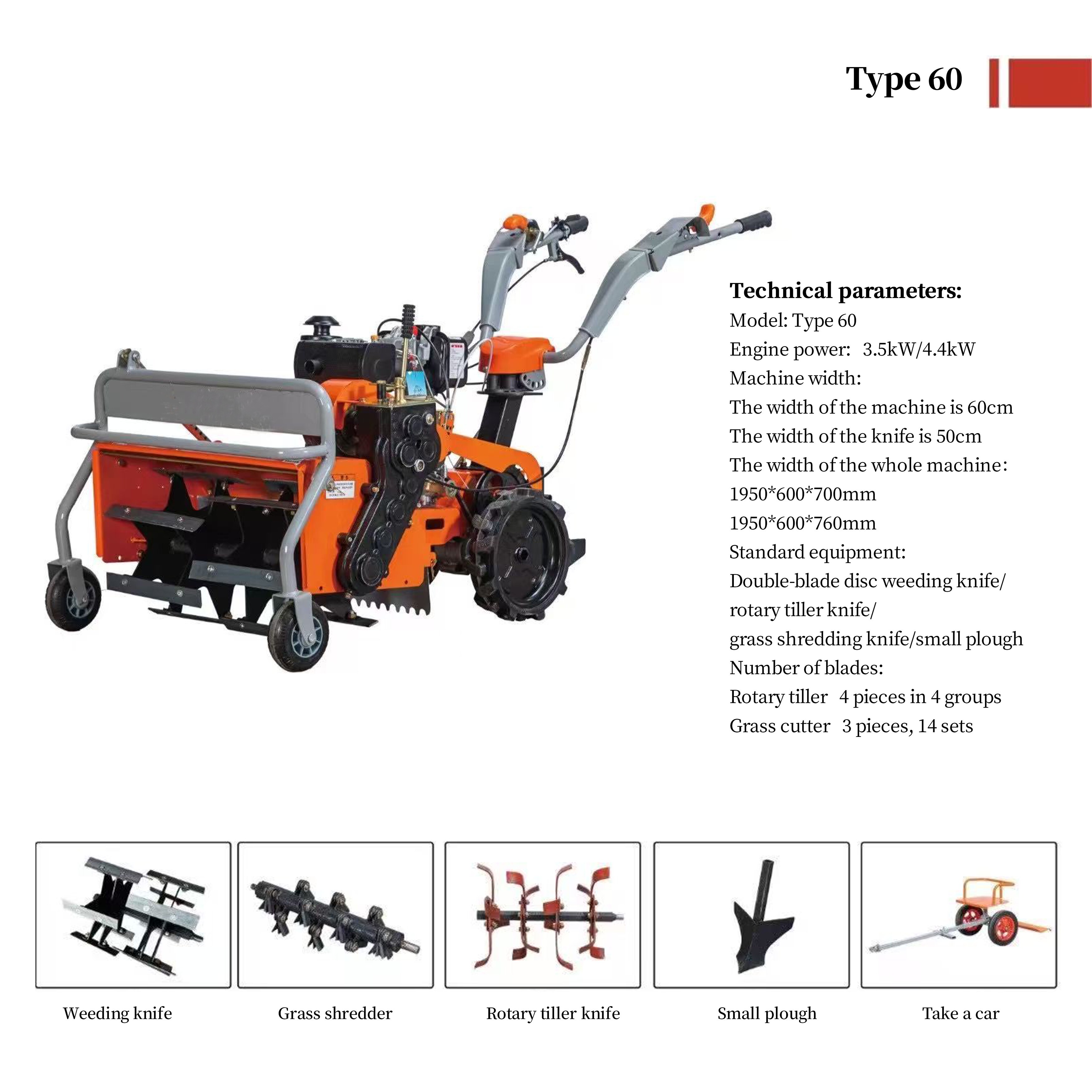 Generally comes with four agricultural implements: weeding knife, grass shredder, rotary tiller, and furrowing plow (a seat can be added).